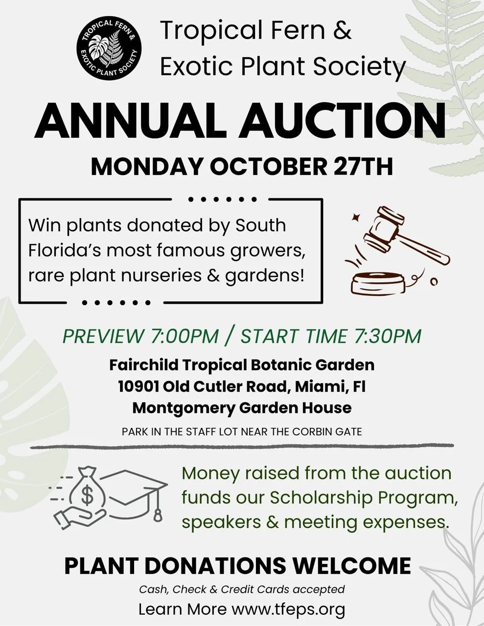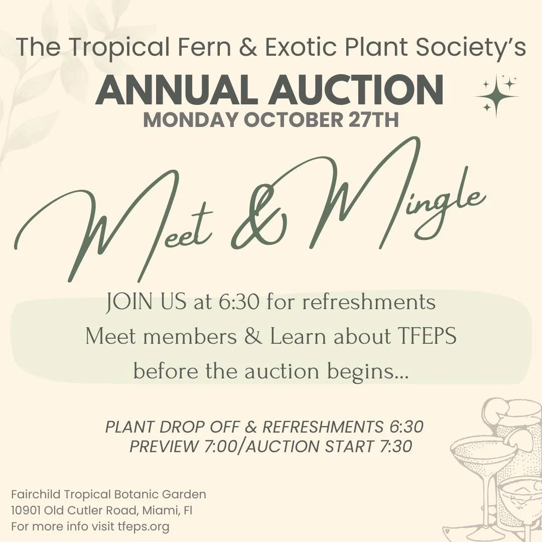 The next meeting is on October 27, 2025 and will be our annual auction. We will have refreshments at 6:30pm, with the auction preview at 7:00pm and the auction beginning promptly at 7:30pm in the Montgomery Garden House at Fairchild Tropical Botanic Garden.